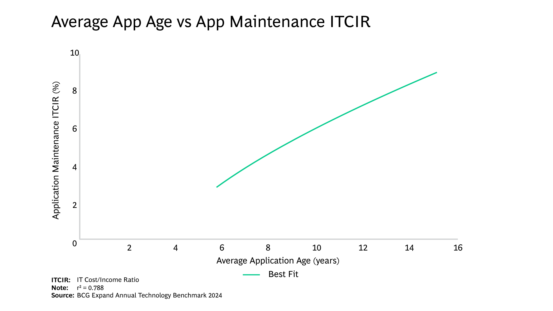 - Maintenance spend rises sharply in tandem with application age.