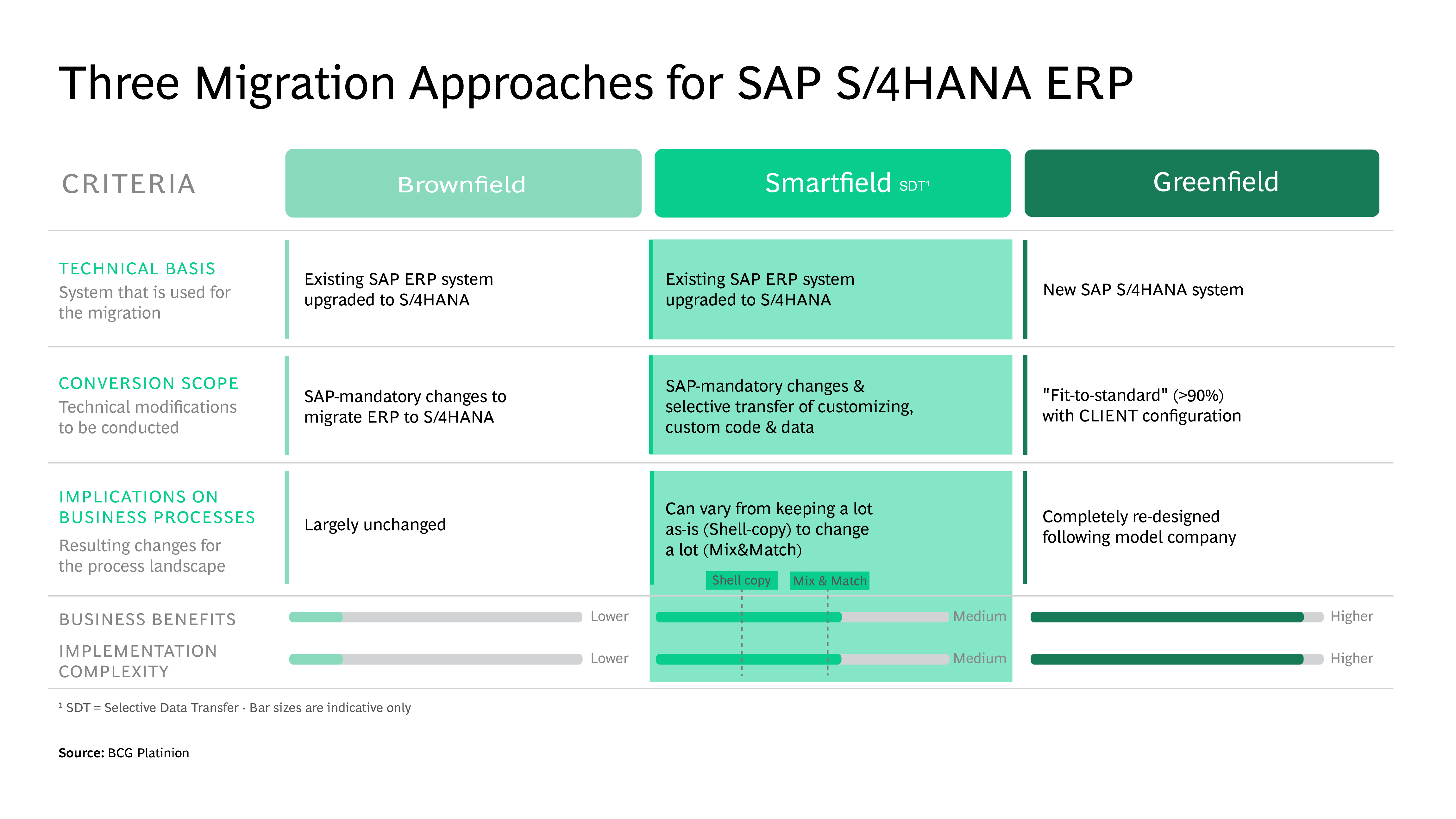 • Smartfield (Selective Data Transition) – Sitting between the brownfield and greenfield options, smartfield approaches are quickly gaining popularity. They fundamentally update the ERP core and can be executed rapidly, aiding broader business transformations